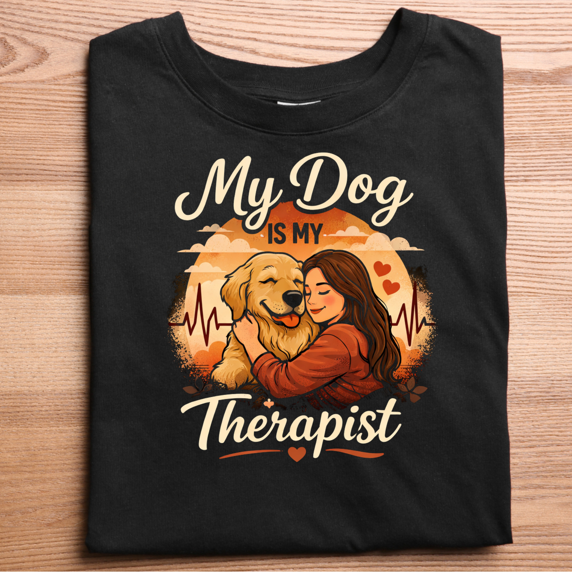 Express your love for your furry companion with this heart warming “My Dog Is My Therapist” T-shirt, featuring a beautiful illustration of a dog and its owner. Perfect for dog lovers who find comfort, joy, and emotional support in their pets.